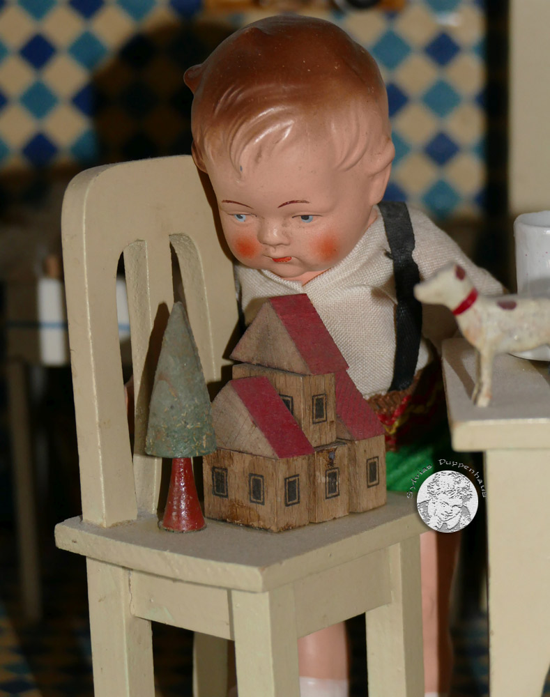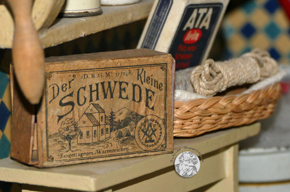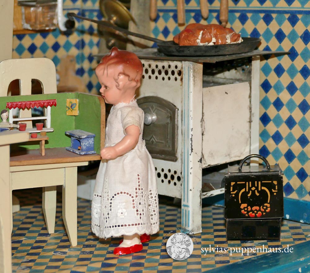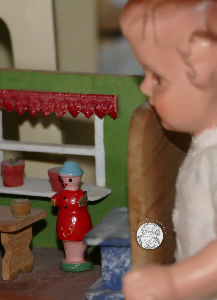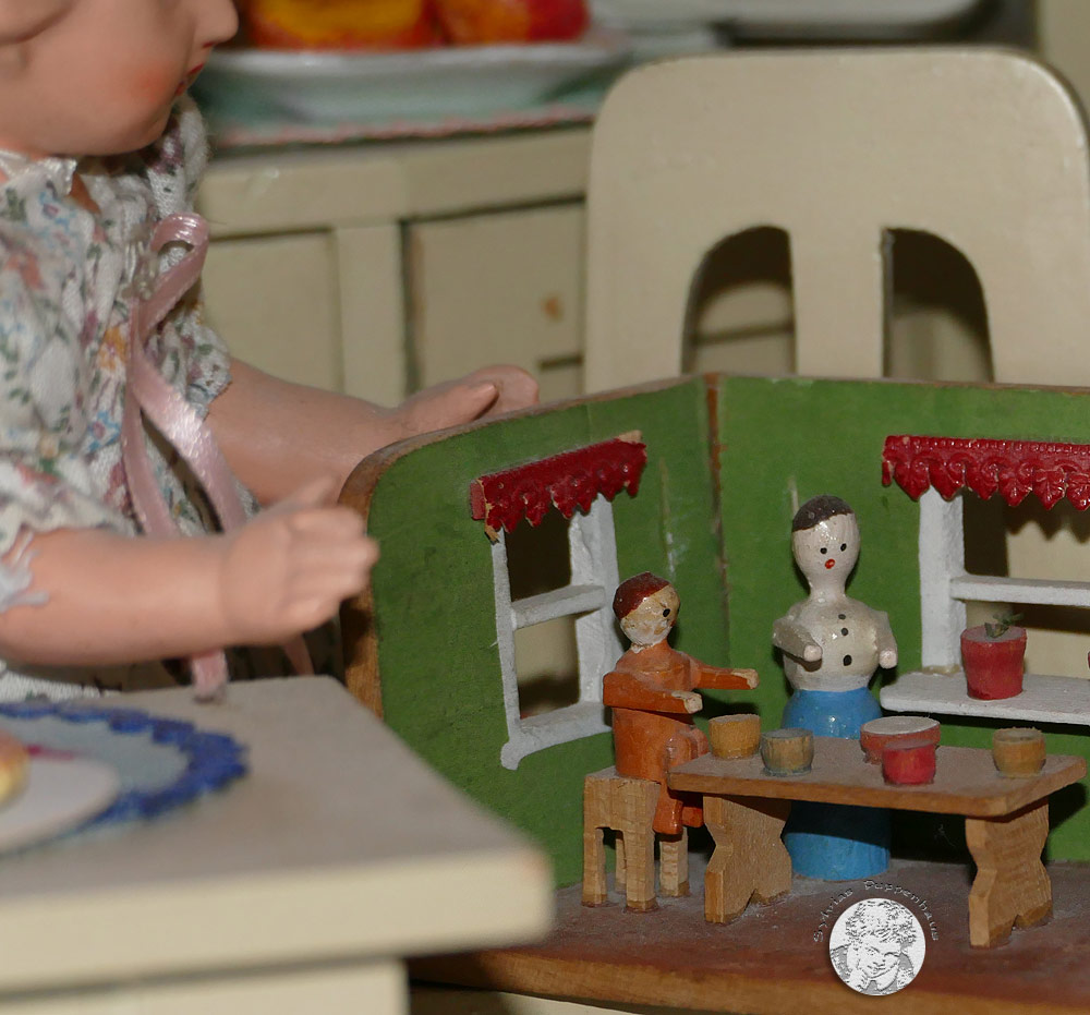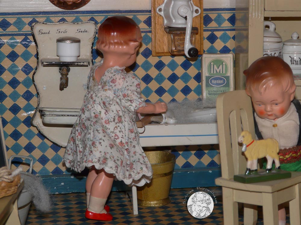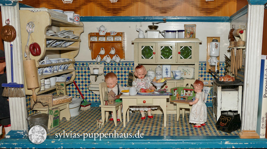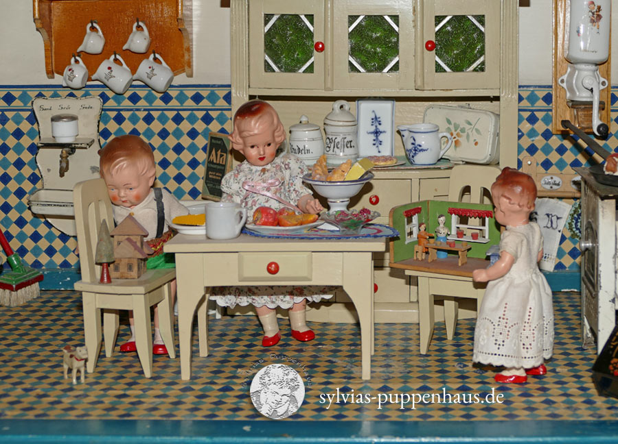 Die Möbel und Einrichtungsgegenstände stammen aus der Zeit von 1900 bis in die 1920er Jahre. Nur die Puppen sind aus den 1930er Jahren und die sind eine echte Bereicherung für die Küche.
